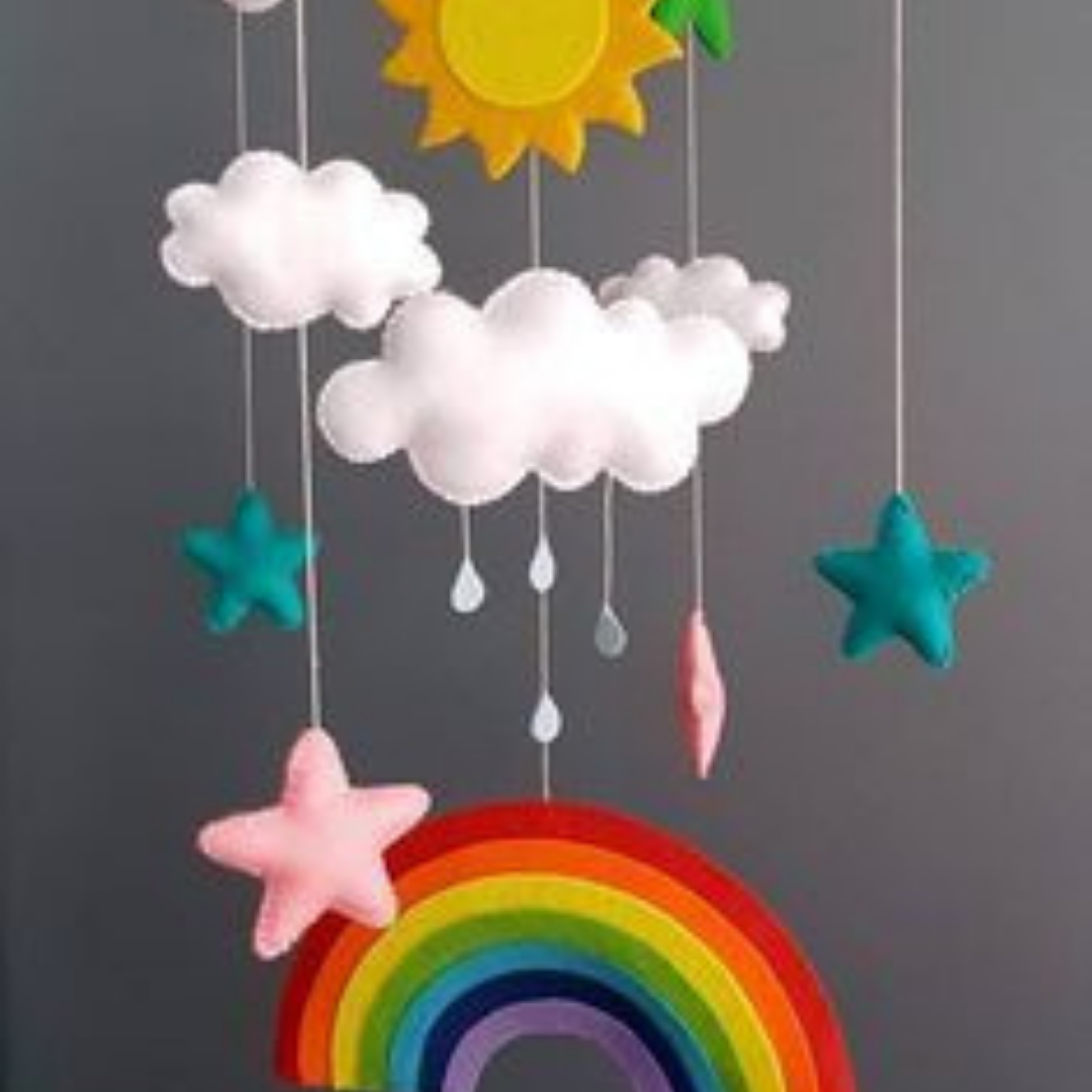 A cheerful handmade felt mobile featuring a rainbow, sun, clouds, raindrops, and stars — perfect for brightening any nursery or child’s room.