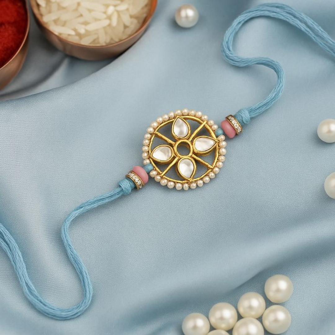 Celebrate the bond of love and protection with this beautifully handcrafted Kundan Pearl Floral Rakhi. The centerpiece features a radiant floral motif with premium white kundan stones, artistically arranged in a golden circular frame, surrounded by delicate mini pearls.